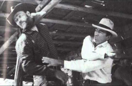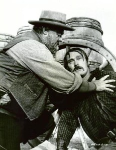 Burl Ives como Rufus Hannessey, e seu inimigo caído ao chão, Major Terrill, vivido por Charles Bickford.