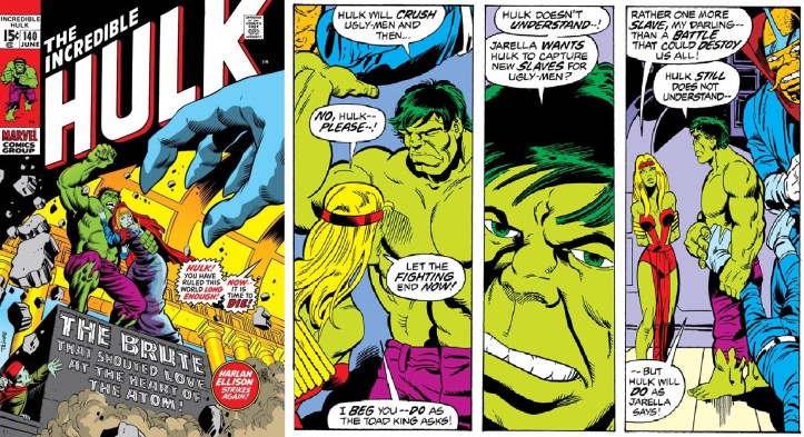 Os anos seguintes à saída de Roy Thomas como roteirista regular do título do Hulk foram curiosos pois, enquanto o ex-professor assumira o posto de editor do título, a revista do gigante verde passaria por uma rotatividade de roteiristas pouco comum em títulos mainstream, com destaque para STEVE ENGLEHART, que assumiu o título por aproximadamente um ano em alternância com outros escritores até a chegada de LEN WEIN em 1974. Nesse ínterim, além de Englehart, roteiristas como GARY FRIEDRICH, ARCHIE GOODWIN, STEVE GERBER, CHRIS CLAREMONT, TONY ISABELLA e GERRY CONWAY contribuíram com o título do Gigante Verde, com histórias que levaram o Hulk a um julgamento em INCREDIBLE HULK #152-153 de 1972 (publicada no Brasil uma única vez em O INCRÍVEL HULK #8 da RGE em 1979) e também a novas incursões ao mundo subatômico de KAI, onde o Hulk encontrou novamente a princesa esverdeada Jarella, que ocasionou o afastamento entre Bruce Banner e Betty Ross, com o consequente casamento da filha do general Ross com o major Glenn Talbot. A princesa do mundo subatômico surgiu em INCREDIBLE HULK #140, a partir de uma premissa criada por um dos maiores escritores de ficção científica dos últimos tempos, HARLAN ELLISON, adaptada por ROY THOMAS e arte de HERB TRIMPE (esboços) e SAM GRAINGER (arte-final), na qual o Hulk é reduzido a um tamanho microscópico e chega ao mundo de KAI, onde ajuda o povo de pele verde contra uma ameaça que pairava sobre aquele mundo. E é nesse mundo que o Hulk conhece, pela primeira vez, a sensação de ser aclamado, reconhecido como herói e amado pelo povo de Jarella, que passa a ver no Gigante Verde um poderoso salvador e protetor. Todas as histórias do Hulk com Jarella foram compiladas na coleção MARVEL GRAPHIC NOVELS (Clássicos XXII) – HULK: NO CORAÇÃO DO ÁTOMO da Editora Salvat, de 2017, incluindo o desfecho com relação ao corpo de princesa em função do seu trágico destino.
