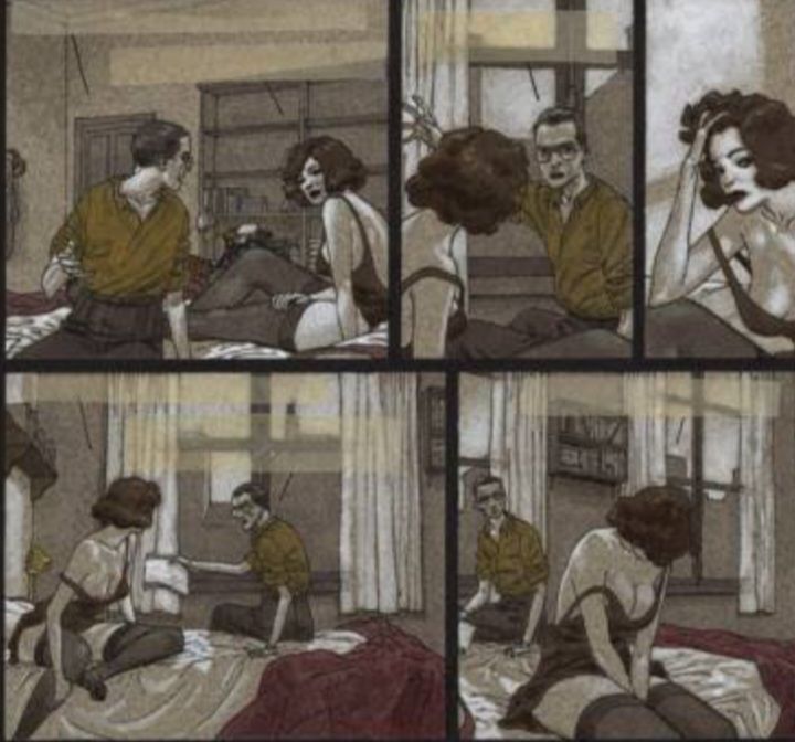 Vale ressaltar que Prado não usa cores apenas como estética, mas como parte essencial da narrativa. Seu impressionante uso cromático reforça estados psicológicos e cria atmosferas que ampliam o sentido das histórias. Em vez de contrastes fortes ou paletas vibrantes, ele escolhe tons mornos, sombreados e melancólicos, num equilíbrio entre o realismo e a poesia visual. O simbolismo visual e cromático em TANGÊNCIAS constrói uma poesia gráfica madura. O autor não apenas ilustra emoções: ele as materializa no espaço, na cor e no silêncio. Cada quadro é uma tela emocional, cada cor carrega memória e desejo, cada sombra diz o que os personagens não ousam. As figuras humanas são desenhadas com um realismo expressivo: gestos contidos, olhares que denunciam inquietações, posturas que revelam desânimo, timidez ou desejo reprimido. Prado sabe representar o corpo de forma sensível e elegante, com sensualidade sutil e nunca gratuita.