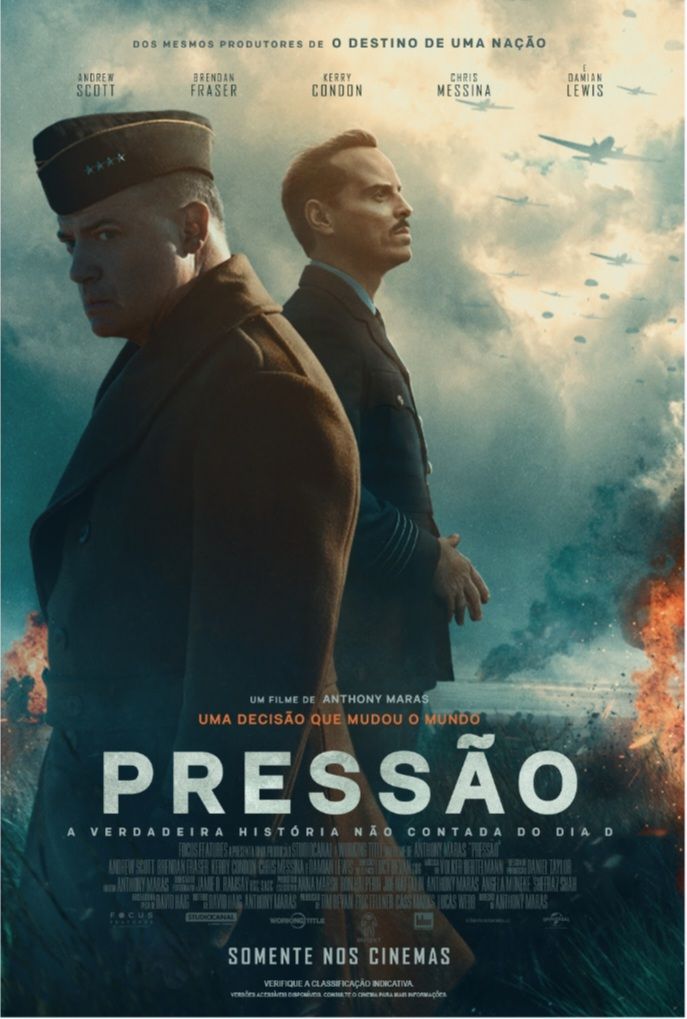 A Focus Features divulgou o poster e o trailer de Pressão (Pressure) em que Brendan Fraser, 57 anos, interpreta o general americano (e futuro presidente) Dwight D. Eisenhower, encarregado de decidir quando iniciar a invasão das forças aliadas à Normandia em 6 de junho de 1944, comumente conhecido como Dia D. O filme narra as 72 horas que antecederam o Dia D, um dos momentos mais decisivos da Segunda Guerra Mundial – através da visão de um time de meteorologistas. A produção é estrelada por Brendan Fraser, vencedor do Oscar por A Baleia (2022) e dirigido pelo australiano Anthony Maras, conhecido por Atentado ao Hotel Taj Mahal. O filme traz também Andrew Scott no papel do Capitão James Stagg, um oficial militar britânico e meteorologista encarregado de fornecer a Eisenhower uma previsão meteorológica precisa, a fim de dar à invasão marítima as melhores chances de sucesso. O elenco inclui Kerry Condon, Chris Messina e Damian Lewis. Lewis, conhecido por sua atuação em Band of Brothers, outro drama sobre a Segunda Guerra Mundial. Pressão estreia nos cinemas americanos em 29 de maio pouco mais de uma semana antes do 82.º aniversário do Dia D e das invasões da Normandia. No Brasil, o filme chega em setembro.